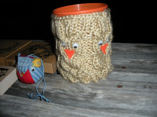I also knitted this owl cup cozie. It is supposed to be for a disposable coffee cup but it came out a bit loose. It fits nicely on several of my drinking glasses though.
